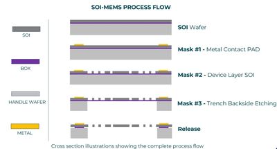 The overall process consists of microfabrication of MEMS devices on a SOI wafer using three masks levels that are PAD METAL, SOI, and TRENCH, respectively. METAL layer for the contact; SOI layer for devices; and TRECNCH for back-side etching, are being used in this technology.